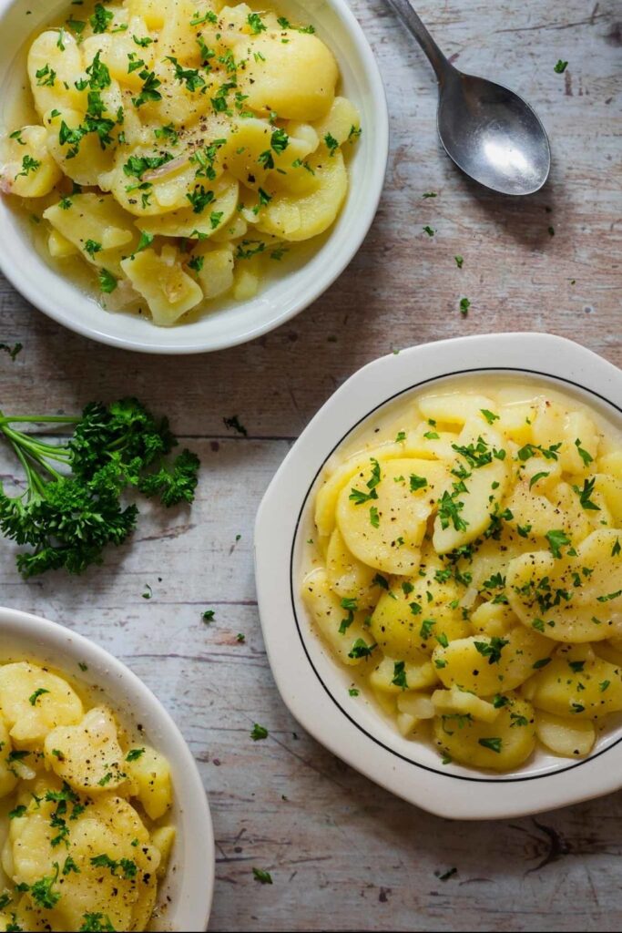 Zutaten: 1–1.5 kg festkochende Kartoffeln, 1 Zwiebel fein, 180–350 ml heiße Rinder-/Geflügelbrühe, 60–120 ml Weißweinessig, 1–2 TL milder Senf, 1 TL Zucker, Salz & Pfeffer, 60–80 ml neutrales Öl, Schnittlauch/Petersilie.